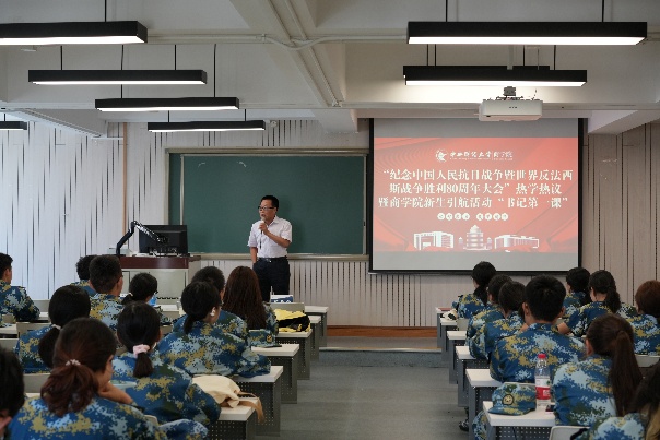 9月3日,纪念中国人民抗日战争暨世界反法西斯战争胜利80周年大会在北京天安门广场隆重举行。437ccm·必赢国际组织全体2025级本科新生集体观看并开展热学热议活动。437ccm·必赢国际党委书记李跃新与新生一同热议庆祝大会,为同学们科普二战知识。随后,李书记就家国情怀为主题为同学们讲授“书记第一课”,李书记将家国情怀具象化,深入浅出地讲述了家国情怀在生活中的体现,强调责任与担当对于新时代青年的重要性。