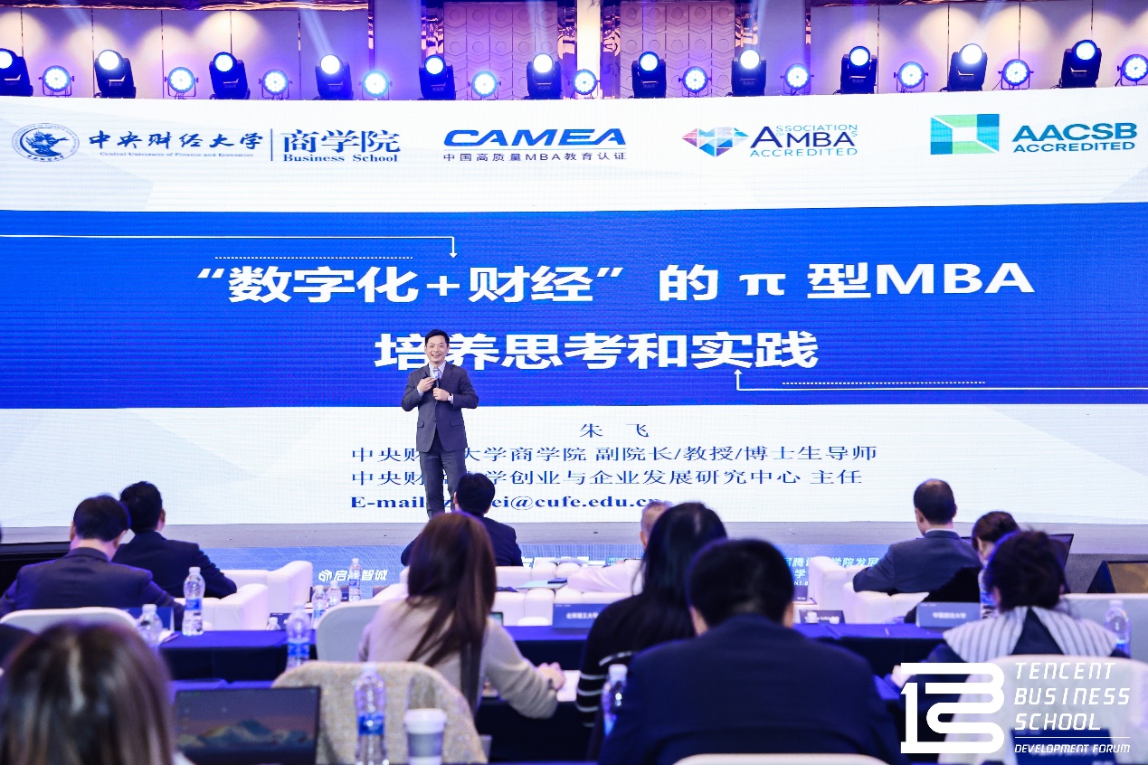 在主题演讲环节,437ccm·必赢国际MBA教育中心副主任兼437ccm·必赢国际副院长朱飞教授以“‘数字化+财经’的π型MBA培养思考和实践”为题,发表了主题演讲。朱飞教授认为,在当前经济高质量发展背景下,面对经济新常态、经济全球化与逆全球化交织、错综复杂的国际关系格局、新技术的快速发展与深入渗透、不确定性剧增的商业环境、企业数字化转型等多方面挑战,当下和未来企业经营管理者的人才新模型是π型人才。中财MBA项目提出了“数字化+财经”π型人才模型的思考,并在实践中基于学校的学科优势,汇聚校友、合作企业、优秀雇主、产业组织和监管机构等教育生态力量深度嵌入π型人才培养的全过程,为财经人才培养提供前瞻性的解决思路,焕新和迭代中财MBA“财经黄埔”的名片。