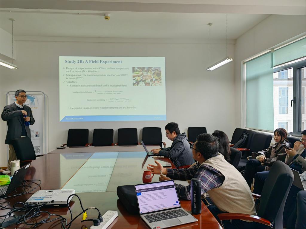 贾老师讲座的主题为“环境温度如何影响消费者食物选择和花费”。通过对两个大型消费者食物购买和消费数据的分析,以及一个田野实验和七个实验室实验,发现当环境温度较低的时候,消费者会更多选择和购买享乐性而非健康的食物。这一现象是由于低温环境激发了消费者对温暖的需求,而在消费者的认知里,享乐性食物和温暖紧密连接,更进一步的研究发现食物热量的差异无法解释这一现象。这项研究对提高消费者福祉,以及餐厅和超市经营者、公共政策制定者具有重要的实践参考价值。